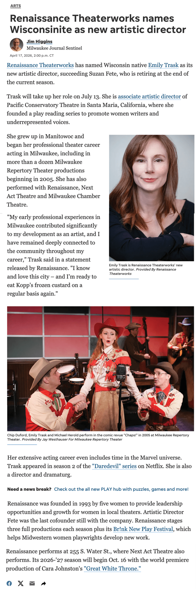 Renaissance Theaterworks has named Wisconsin native Emily Trask as its new artistic director, succeeding Suzan Fete, who is retiring at the end of the current season. pdf